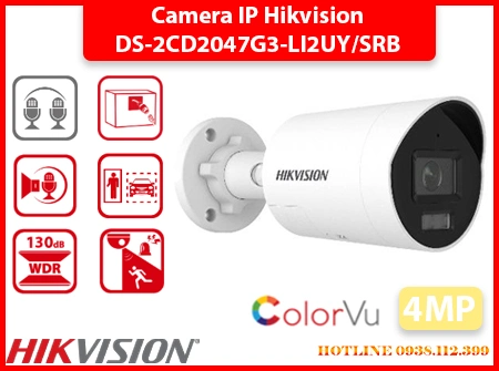 Camera DS-2CD2047G3-LI2UY/SRB ghi hình màu 24/7 nhờ cảm biến 1/1. 8", độ phân giải 4MP cùng công nghệ HikAI-ISP. Tích hợp đèn hồng ngoại và ánh sáng trắng 40m, thu âm kép, đàm thoại 2 chiều, chống ngược sáng thực 130dB và hỗ trợ thẻ nhớ 512GB, phù hợp lắp ngoài trời nhờ chuẩn IP67.